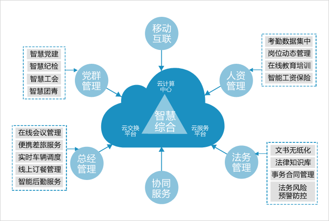 整合企业内部资源,加强综合管控,深化体系统筹,建设综合服务一体化系统,进行党群、总经、人资、法务信息化管理,实现移动化办公、要事督办、服务任务智能分配、服务后评价等业务功能,实现综合业务信息数字化、数据共享化、工作高效化。